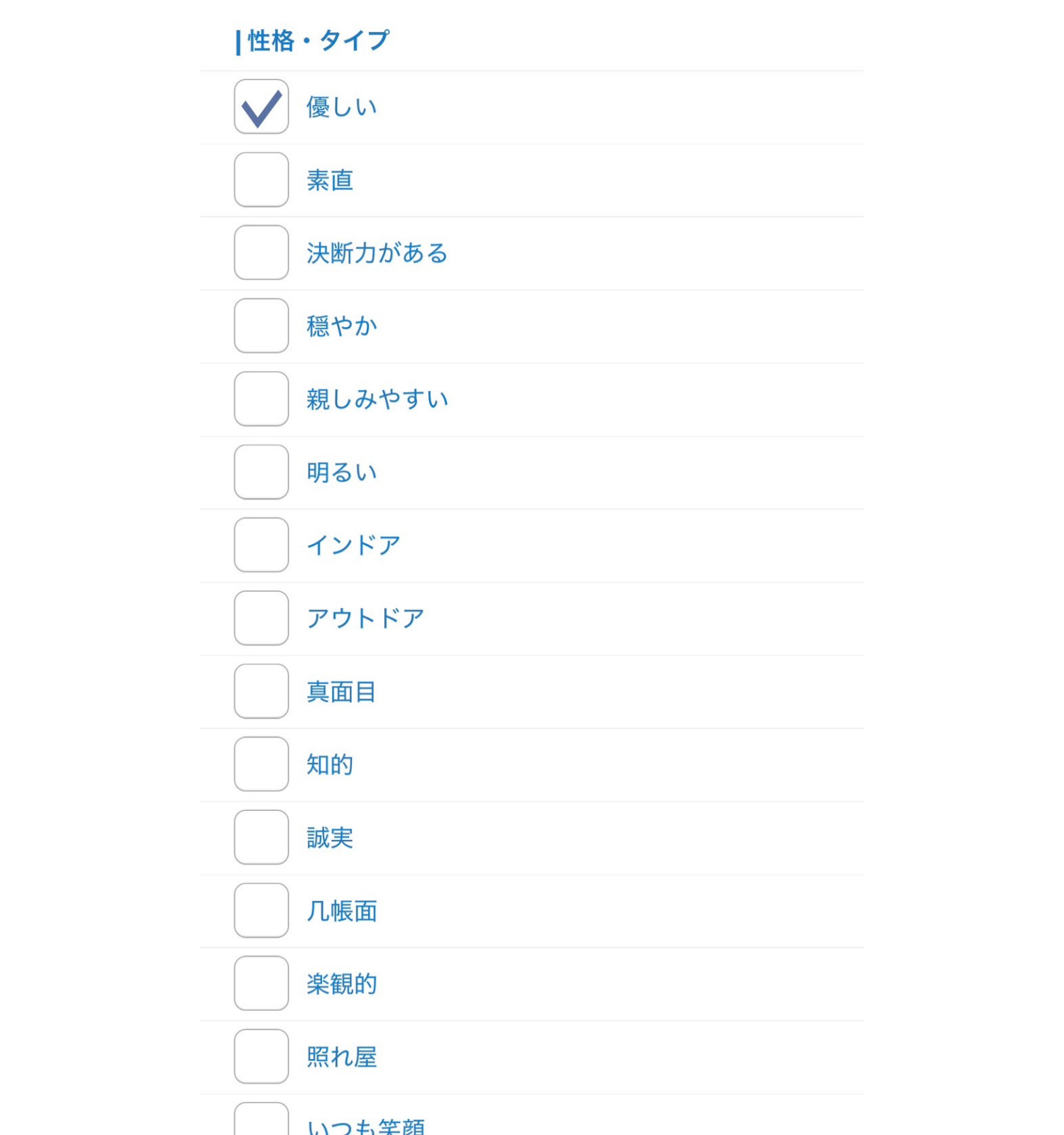 例として、Omiaiの基本情報として登録できる「性格・タイプ」では、優しい/素直/穏やか/親しみやすい/真面目/照れ屋/上品など、全37項目から選べます。